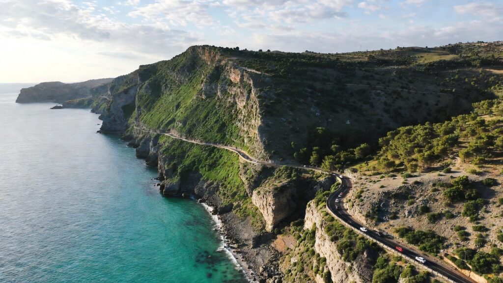Ce n’est pas juste une route, c’est une aventure. Longue d’environ 100 kilomètres, ce tracé est une prouesse. Taillée à même la roche, suspendue entre ciel et mer, la route serpente dangereusement (et magnifiquement) le long des côtes. D’un côté, vous avez les forêts denses de la Kabylie et de la région des Babors, verdoyantes, humides, presque tropicales. De l’autre, la Méditerranée dans ses nuances les plus indécentes de bleu et de turquoise.